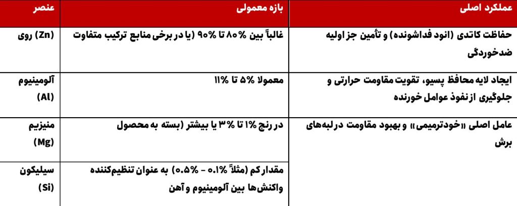 انتخاب نسبت عناصر پوشش: ترکیب دقیق Zn, Al و Mg و کنترل آن تأثیر مهمی بر عملکرد دارد — برای مثال، پوشش Zn–6Al–3Mg یکی از ترکیبهای رایج و مؤثر است.