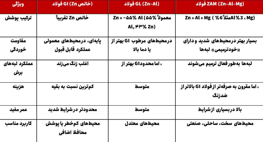 برای درک بهتر مزایای ZAM، مقایسه آن با دو پوشش متداول یعنی GI (گالوانیزهی خالص روی) و GL (گالوالوم یا پوشش آلومینیوم-روی) مفید است: